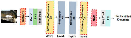 Overall framework of the cow individual recognition model. The QAConv module is introduced to adapt to the scale changes in the target. The proposed Dynamic_Bottleneck replaces the first and fourth bottleneck layers for the accurate extraction of local features and global information of cows. NAM is embedded for the feature fusion in the channel-spatial dimension.