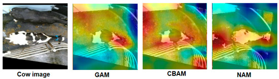 Figure 10 visualizes the heatmaps of different attention modules. GAM and CBAM simultaneously focus on the body of cows and a large number of background areas, which is not conducive to capturing key features of cows and thus reduces the accuracy of identifying individual cows. Compared with GAM and CBAM, NAM focuses more on the torso area of cows, and reduces interference with irrelevant backgrounds.