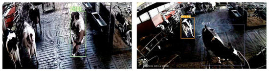 For the dataset in the milking room, we directly adopt the proposed method for individual cow recognition. In another dataset, each cow video frame contains multiple cows. We labeled a small portion of images in the dataset and fine-tuned the pretrained YOLOv8 to detect the cow targets. Next, we cropped the cow targets in the bounding boxes generated by YOLOv8. The cropped images were regarded as the images in Query set, then, the cow individual recognition model matched the cropped cow target images with the images in Gallery set, in order to identify the ID number of the cow in the video frame. Since we selected 30 individual cows, only these 30 cows in the dataset can be assigned ID numbers, as shown in Figure 11.