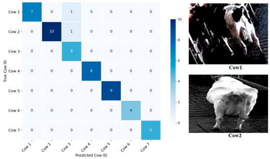 Confusion matrix for individual identification of cows. (Left): confusion matrix; (Right): two mis-identified cow images.