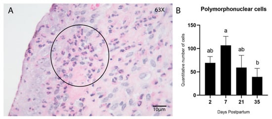 Infiltration of PMN cells in the endometrial stroma during postpartum. Hematoxylin and Eosin (HE) (A) Endometrial biopsy of bovine uterus. Representative image of the infiltration of PMN inflammatory cells in the endometrial stroma during the postpartum involution process (Day 7); a cluster of PMN cells is noticeable below the epithelium (encircled). The images were obtained using Aperio ImageScope x64 12.4.6 software (Leica Biosystems), magnification 630×, scale 10 µm. (B) Quantitative analysis of PMN cells showed a peak of increased infiltration on Day 7 postpartum, which gradually decreased by Day 35. (p < 0.05; Tukey–Kramer HSD test). Different letters are statistically significant (p < 0.05). Results are presented as mean ± standard error of the mean (S.E.M.).