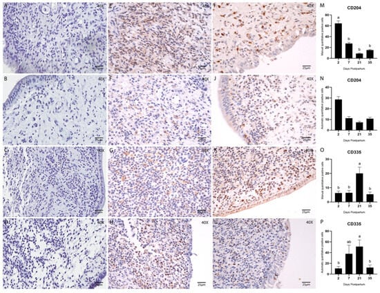 Immunostaining and quantification of Macrophage cells using the M2 macrophages CD204 (1:100) and NK cells using CD335 (1:200). Counterstained with Hematoxylin. (A–D) Negative controls, stained with hematoxylin only, are the same for all antibodies and were used to confirm tissue morphology preservation. (E–H) Endometrial biopsies of bovine uterus. Immunostaining for CD204 on Days 2, 7, 21, and 35 postpartum, respectively. (I–L) Endometrial biopsies of bovine uterus. Immunostaining for CD335 on Days 2, 7, 21, and 35 postpartum, respectively. The images were obtained using Aperio ImageScope x64 12.4.6 software (Leica Biosystems), magnification 400×, scale 25 µm. (M,N) Manual (M) and automatic (N) counting of CD204-positive cells. (O,P) Manual (O) and automatic (P) counting of CD335-positive cells. Different letters are statistically significant (p < 0.05). The absence of letters denotes no significant difference among groups. Results are presented as mean ± standard error of the mean (S.E.M.).