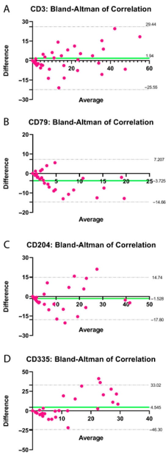 Bland–Altman plot showing the differences between manual and automated quantification of positively marked cells in the bovine endometrium for CD3 (A), CD79 (B), CD204 (C) and CD335 (D) during the postpartum period, plotted against the average of the two methods (pink dots). The bias is indicated by the distance between the zero-difference line (X-axis) and the solid green line. The limits of agreement are represented by the dashed lines parallel to the X-axis. Numerical values for the bias and limits of agreement are displayed adjacent to their respective lines.