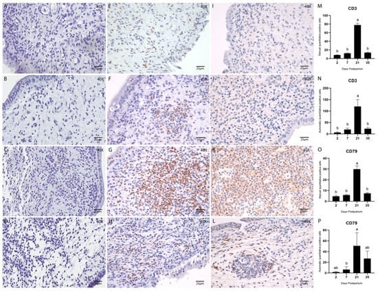 Endometrial biopsies of bovine uterus. Immunostaining and quantification of T cells using CD3 (1:100) and B-cells using CD79 (1:100) and counterstained with Hematoxylin. (A–D) Negative controls, stained with Hematoxylin only, are the same for all antibodies and were used to confirm tissue morphology preservation. (E–H) Endometrial biopsies of bovine uterus. Immunostaining for CD3 on Days 2, 7, 21, and 35 postpartum, respectively. (I–L) Endometrial biopsies of bovine uterus. Immunostaining for CD79 on Days 2, 7, 21, and 35 postpartum, respectively. The images were obtained using Aperio ImageScope x64 12.4.6 software (Leica Biosystems), magnification 400x, scale 25 µm. (M,N) Manual (M) and automatic (N) counting of CD3-positive cells. (O,P) Manual (O) and automatic (P) counting of CD79-positive cells. Different letters are statistically significant (p < 0.05). Results are presented as mean ± standard error of the mean (S.E.M.).