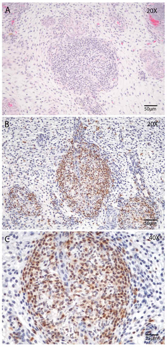 Presence of lymphoid nodules in the endometrial stroma during postpartum Day 21. (A,B) Endometrial biopsy of bovine uterus. (A) Lymphoid nodule in the endometrial stroma, Hematoxylin and Eosin (HE), magnification 200×, scale 50 µm. (B) Lymphoid nodules in the endometrial stroma immunostaining (counterstained with Hematoxylin), magnification 200×, scale 50 µm and (C) magnification 400×, scale 25 µm Immunostaining for T cells using the CD3 marker (1:100). The images were obtained using Aperio ImageScope x64 12.4.6 software (Leica Biosystems).