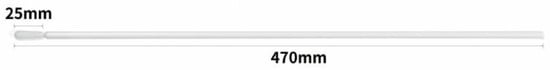 - Pig with abnormal behavior: Pigs with signs of fever, anorexia, abortion, vomiting, lameness, or any abnormal appearance should be identified and sampled for an ASFV test. A throat swab sample, as a preferred method of sampling for ASFV [21], is collected using a long swab, as shown in Figure 2. Technicians should wear disposable long-arm gloves when sampling. Additional environmental samples are collected around the abnormal pig using cotton swabs and pooled in the same sampling tube with the throat swab. Abnormal pigs sampled per day typically account for approximately 1.5–2% of the herd as routine monitoring. Aborted sows should be sampled for three consecutive days and then tested again a week after to confirm a negative test result. Treatments for abnormal pigs are held until the day after the PCR results are available to avoid potential spread of disease during the treatment procedure.