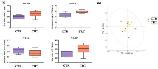 Effects of S. cerevisiae hydrolysate on the alfa (a) and beta (b) diversity of the caecal microbiota in broilers. OTU: operational taxonomic units. CTR: control group; TRT: treated group with S. cerevisiae hydrolysate. (n = 6 replicates (subjects) per group).