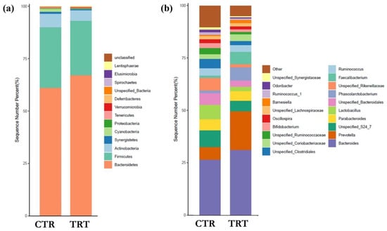 Taxonomic composition of the broiler caecal microbiota at phylum (a) and genus (b) level. CTR: control group; TRT: treated group with S. cerevisiae hydrolysate. (n = 6 replicates (subjects) per group).