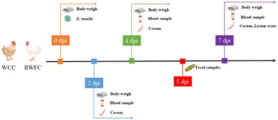 Seventy-one-day-old WCCs and seventy-one-day-old RWFCs, supplied by the National Gene Bank of Local Chicken Breeds (Jiangsu), were transported to the laboratory immediately after hatching and raised under standardized conditions in a coccidia-free environment. All experimental chickens remained unvaccinated and were provided with a complete, pathogen-free diet. Prior to the experiment, fecal samples from all chickens were subjected to microscopic examination using the saturated saline flotation technique to ensure the absence of Eimeria oocysts. Only chickens confirmed to be free from contaminating oocysts were used for the experiment. Throughout the entire experimental period, the chickens had ad libitum access to both feed and water.