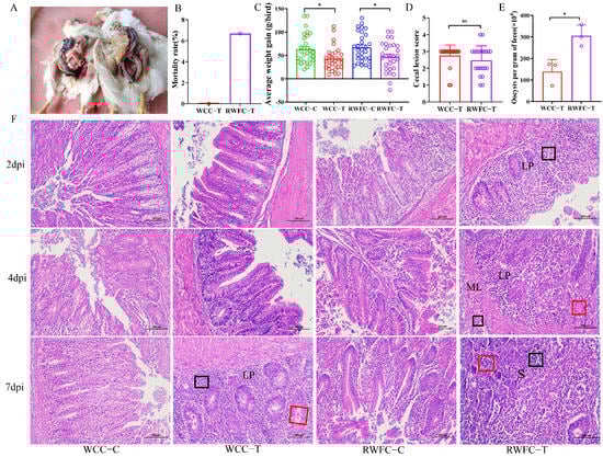 Clinical symptoms of WCCs and RWFCs infected with E. tenella. (A) Two RWFCs died at 5 dpi. (B) Mortality rate statistics were recorded for both chicken breeds. (C) Average weight gain of the two chicken breeds. (D) Cecal lesion scores of the two chicken breeds. (E) Oocyst count per gram of feces from the two chicken breeds. (* p < 0.05; ns, not significant). (F) Panels representing pathological changes in each group at 2, 4, and 7 dpi. No significant inflammatory cell infiltration was observed in the ceca of uninfected WCCs (WCC−C) and uninfected RWFCs (RWFC−C). However, lymphocyte infiltration (shown by black boxes) was evident in the ceca of infected WCCs (WCC−T) and infected RWFCs (RWFC−T), along with schizonts or oocysts (shown by red boxes). Abbreviations: LP, lamina propria; ML, muscularis mucosae; S, submucosa. (n = 3, H&E staining, magnification ×200.)