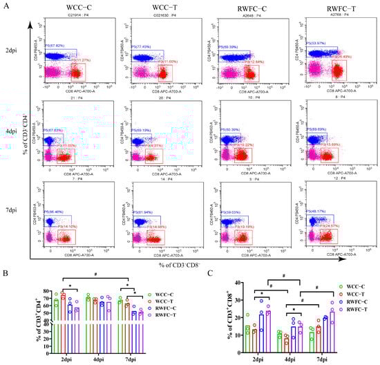 Changes in CD3+CD4+ and CD3+CD8α+ T cell populations following WCC and RWFC infection with E. tenella. The percentages of CD3+CD4+ and CD3+CD8α+ T cells were assessed at 2, 4, and 7 dpi using FACS. (A) Panels illustrating the distributions of CD3+CD4+ and CD3+CD8α+ T cells for each group at the specified time points (2, 4, and 7 dpi). Cells shown in pink represent CD3⁺ T lymphocytes that are negative for both CD4 and CD8α. (B) Percentages of CD3+CD4+ T cells within peripheral blood T lymphocytes were quantified via FACS analysis. (C) Percentages of CD3+CD8α+ T cells in peripheral blood T lymphocytes were determined using FACS. Unpaired t-tests were conducted to evaluate the differences between the control and infection groups within the same breed at identical time points, as well as the inter-group differences between the WCC−T and RWFC−T groups and between the WCC−C and RWFC−C groups at corresponding time points (* p < 0.05). One-way ANOVA followed by Dunnett’s multiple comparisons test was utilized to evaluate differences between infected groups versus their respective controls at 2, 4, and 7 dpi (# p < 0.05).