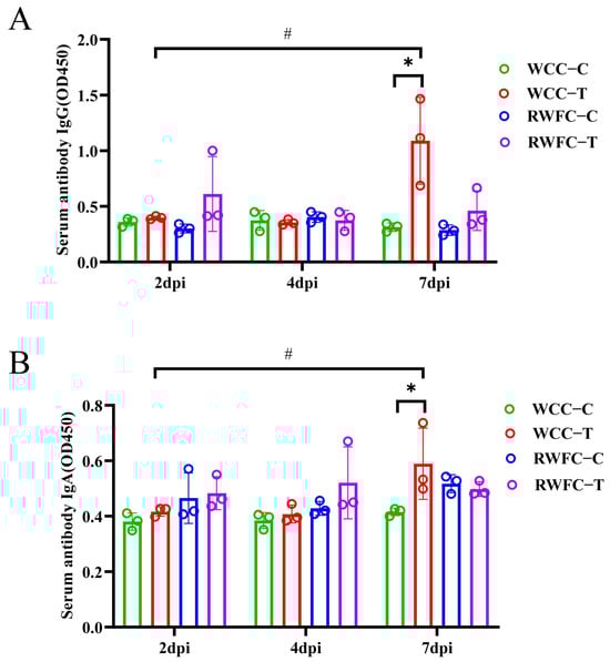 Levels of IgG and IgA antibodies in WCCs and RWFCs following E. tenella infection. (A) Measurement of serum IgG levels in WCCs and RWFCs at 2, 4, and 7 dpi using ELISA. (B) Measurement of serum IgA levels in WCCs and RWFCs at 2, 4, and 7 dpi utilizing ELISA techniques. An unpaired t-test was utilized to evaluate the differences between the control groups and their corresponding infected groups of the same breed at each time point, as well as to compare the differences between WCC−Tand RWFC−T, and between WCC−C and RWFC−C at identical time points (* p < 0.05). A one-way ANOVA followed by Dunnett’s multiple comparisons test was utilized to evaluate the differences between the infected groups and their respective control groups at 2, 4, and 7 dpi (# p < 0.05).