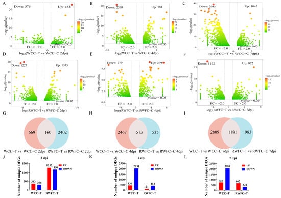 The number of DEGs in WCCs and RWFCs at 2, 4, and 7 dpi. (A–C) Volcano plots illustrating the comparison of DEGs between WCC−Tand WCC−Cat 2 dpi (A), 4 dpi (B), and 7 dpi (C). (D–F) Volcano plots depicting the comparison of DEGs between RWFC−Tand RWFC−Cat 2 dpi (D), 4 dpi (E), and 7 dpi (F). The numbers of significantly downregulated and upregulated DEGs were shown at the top of each plot. (G–I) Venn diagram analyses comparing WCC−T between and RWFC−Tat 2 dpi (G), 4 dpi (H), and 7 dpi (I). (J–L) Number of specifically expressed DEGs in WCC−T relative to RWFC−Tat 2 dpi (J), 4 dpi (K), and 7 dpi (L).