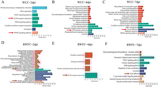 At 2 dpi, WCC–specific DEGs were significantly enriched in eight pathways, five of which were associated with environmental information processing (Figure 6A). In contrast, RWFC–specific DEGs were enriched in 25 pathways, with 14 associated with metabolic processes (Figure 6D). At 4 dpi, the number of enriched pathways in WCCs increased to 15, primarily involving metabolic pathways (9) and environmental information processing (5) (Figure 6B), whereas RWFC enrichment dropped sharply to four pathways, three of which were metabolic (Figure 6E). By 7 dpi, WCCs maintained enrichment in fifteen pathways (nine metabolic), while RWFC enrichment rose to twelve pathways (Figure 6C,F).