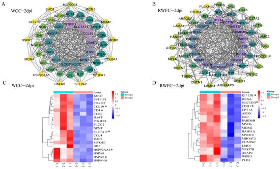 Gene–gene interaction network and heatmap analysis of the WCC–specific and RWFC–specific DEGs at 2 dpi. (A) Gene–gene interaction network of the selected WCC–specific DEGs. (B) Gene–gene interaction network of the selected RWFC–specific DEGs. (C) Heatmaps depicting selected genes from the gene–gene interaction network of WCC–specific DEGs. (D) Heatmaps depicting selected genes from the gene–gene interaction network of RWFC–specific DEGs. The dimensions and hues of the circles reflect the magnitude of the degree scores. Furthermore, the data visualization conventions in Figure A2, Figure A3 and Figure A4 adhered to the same principles. The genes highlighted with asterisks in the heatmap will be utilized for subsequent qRT−PCR validation experiments.