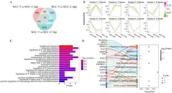 Analysis of overlapping DEGs following E. tenella infection in the WCC. (A) Venn diagram illustrating the overlap of DEGs in the WCC at 2 dpi (light orange, n = 829), 4 dpi (light blue, n = 2980), and 7 dpi (light green, n = 3990), resulting in 93 intersecting genes. (B) Fuzzy c-means clustering revealed eight distinct temporal expression patterns among the intersecting genes. The x-axis represents the three time points post-infection, while the y-axis shows log2-transformed and normalized intensity ratios. (C) The top 20 most significantly enriched GO pathways. (D) The Sankey plot illustrates the top 10 pathways with significantly enriched intersection genes in the WCC. A dot plot illustrates the proportion of WCC−T genes in relation to the total number of genes within each significantly enriched pathway (p ≤ 0.05). Genes marked with asterisks in the heatmap were selected for subsequent qRT−PCR validation.