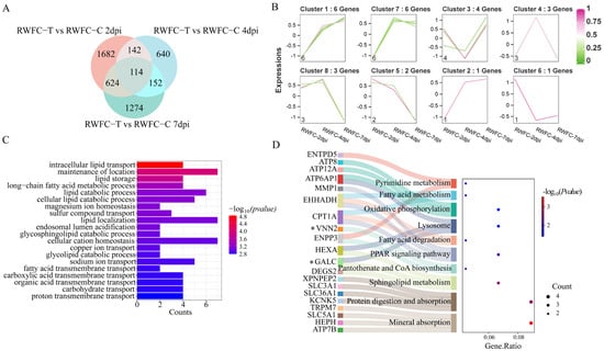 Analysis of overlapping genes following RWFC infection with E. tenella. (A) Venn diagram displays the overlapping of 2562 DEGs at 2 dpi (light orange), 1048 DEGs at 4 dpi (light blue), and 2164 DEGs at 7 dpi (light green), resulting in a total of 114 overlapping genes. (B) Trend analysis of the overlapping genes at 2, 4, and 7 days post-RWFC infection. The x-axis denotes the three time points following infection, while the y-axis illustrates the log2-transformed and normalized intensity ratios at each respective time point. (C) GO analysis of the top 20 most enriched GO pathways. (D) Sankey plot illustrating the top 10 significantly enriched pathways within the overlapping genes of the RWFC. The dot plot depicted the ratio of RWFC−T to RWFC−Cin relation to the total number of genes within each enriched pathway (p ≤ 0.05). Genes marked with asterisks in the heatmap were selected for subsequent qRT−PCR validation.