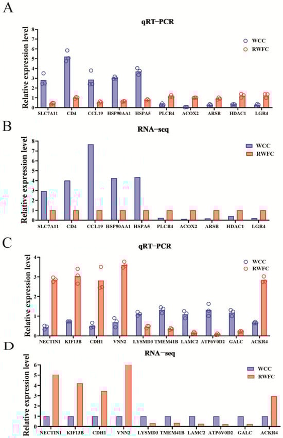 To validate the DEGs specific to WCCs and RWFCs, we quantified the relative expression levels of 10 known genes in each breed using qRT−PCR. The target genes identified in WCCs included SLC7A11, CD4, CCL19, HSP90AA1, HSPA5, PLCB4, ACOX2, ARSB, HDAC1, and LGR4. In RWFCs, the selected target genes were NECTIN1, KIF13B, CDH1, VNN2, LYSMD3, TMEM41B, LAMC2, ATP6V0D2, GALC, and ACKR4. Except for VNN2 and GALC, these genes exhibited relatively high node degree values in the gene–gene interaction network. The results revealed that the expression profiles of the selected genes were consistent with the RNA sequencing data (Figure 10). These findings suggest that RNA−seq is a highly accurate and reliable method for investigating transcriptomic changes in WCCs and RWFCs following infection with E. tenella.