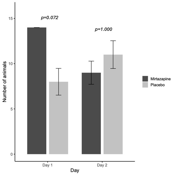 When evaluating the orexigenic efficacy of mirtazapine (Figure 1), on the first day all animals that received mirtazapine (n = 14/14; 100%) had food acceptance and this rate was higher than placebo group (7/11; 63.6%). While on the second day, there is no difference between the rate of food acceptance between groups mirtazapine (10/11) and placebo (11/14) (Figure 1).