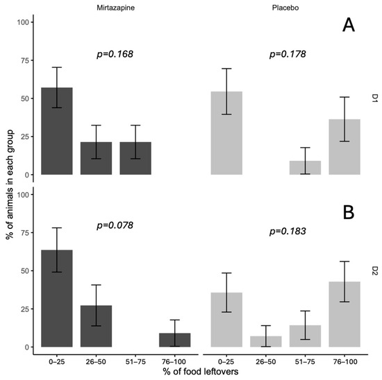 Percentage of food leftovers and distribution of animals by consumption groups following mirtazapine or placebo administration, on (A) first day 1 and (B) second day.