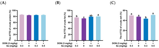 Effects of dietary selenium (Se) supplementation levels on the apparent total tract digestibility (ATTD) of nursery piglets exposed to deoxynivalenol (DON) (n = 6, mean ± SEM). (A) The ATTD of crude protein. (B) The ATTD of crude fat. (C) The ATTD of crude ash. Different letters above the bars indicate statistical differences among the treatment groups (p < 0.05).