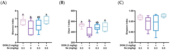 Effects of dietary selenium (Se) supplementation levels on the α-diversity of cecum microbiota of nursery piglets exposed to deoxynivalenol (DON) (n = 6). (A) Shannon index. (B) Chao 1 index. (C) Simpson index. Different letters above the bars indicate statistical differences among the treatment groups (p < 0.05).