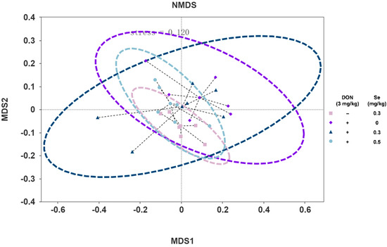 Figure 2 displays the effects of the dietary Se supplementation levels on the α-diversity of the cecum microbiota of nursery piglets exposed to DON. The Simpson index of the cecum microbiota in nursery piglets was not influenced by the dietary treatments (p > 0.05). However, compared with the 0.3 mg/kg Se group, the Shannon index and Chao 1 index were decreased in the cecum microbiota of nursery piglets from the 0 mg/kg Se + DON group (p < 0.05). In contrast, compared to the 0 mg/kg Se + DON group, the Shannon index and Chao 1 index were increased in the cecum microbiota of nursery piglets from the 0.5 mg/kg Se + DON group (p < 0.05). Furthermore, a statistically significant difference was observed in the β-diversity of the cecum microbiota in piglets between the 0.3 mg/kg Se group and the 0.3 mg/kg Se + DON group (p < 0.05) (Figure 3).