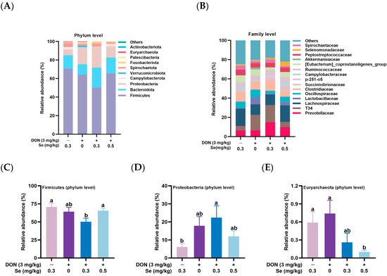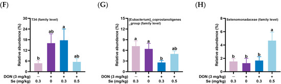 Figure 4 illustrates the cecal microbial composition at the phylum level (top 10 phyla) and family level (top 15 families) in the nursery piglets in response to the dietary treatments. At the phylum level, compared with the 0.3 mg/kg Se group, piglets in the 0.3 mg/kg Se + DON group had a decreased relative abundance of Firmicutes and increased relative abundance of the Proteobacteria in the cecum (p < 0.05). Additionally, piglets in the 0.5 mg/kg Se + DON group had a higher relative abundance of Firmicutes compared to the 0.3 mg/kg Se + DON group, and a lower relative abundance of Euryarchaeota compared to the 0 mg/kg Se + DON group (p < 0.05). At the family level, compared with the 0.3 mg/kg Se group, piglets in the 0.3 mg/kg Se + DON group had a higher relative abundance of T34 and lower relative abundance of [Eubacterium]_coprostanoligenes_group in the cecum (p < 0.05). Furthermore, compared to the 0.3 mg/kg Se + DON group, piglets in the 0 mg/kg Se + DON group had an increased relative abundance of [Eubacterium]_coprostanoligenes_group in the cecum (p < 0.05). Additionally, the relative abundance of Selenomonadaceae was higher in piglets from the 0.5 mg/kg Se + DON group compared to the other three treatment groups (p < 0.05).