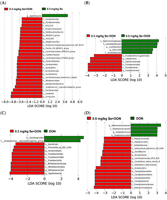 Linear discriminant analysis (LDA) effect size analysis of cecum microbial community alterations (n = 6) (LDA scores > 3.0). (A) The 0.3 mg/kg Se + DON group vs. 0.3 mg/kg Se group. (B) The 0.3 mg/kg Se + DON group vs. 0.5 mg/kg Se + DON group. (C) The 0.3 mg/kg Se + DON group vs. 0 mg/kg Se + DON group. (D) The 0.5 mg/kg Se + DON group vs. 0 mg/kg Se + DON group.
