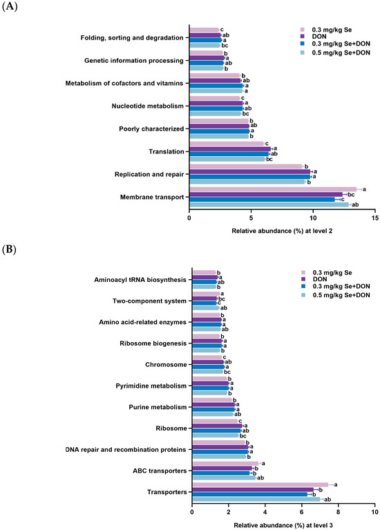 The PICRUSt analysis was conducted to infer the metabolic potential of cecal microbiota in nursery piglets subjected to four dietary treatments. At level 2 of metabolic pathway classification, piglets in the 0.3 mg/kg Se + DON group demonstrated reduced membrane transport alongside elevated functions in replication and repair, translation, poorly characterized processes, nucleotide metabolism, cofactor and vitamin metabolism, and folding, sorting, and degradation relative to those receiving 0.3 mg/kg Se alone. These findings further indicate that DON exposure disrupts gut microbiota, thereby negatively influencing their metabolic functions [38]. However, an elevated Se level of 0.5 mg/kg alleviated the metabolic dysfunctions induced by DON exposure, as evidenced by enhanced membrane transport activity but reduced functions related to replication and repair, poorly characterized processes, and folding, sorting, and degradation compared to the 0.3 mg/kg Se + DON group. Consistently, at metabolism level 3, piglets in the 0.3 mg/kg Se + DON group exhibited reduced levels of transporters, ABC transporters, and two-component systems, while displaying elevated levels of DNA repair and recombination proteins, ribosome activity, purine metabolism, pyrimidine metabolism, chromosome function, ribosome biogenesis, and amino acid-related enzymes compared to the 0.3 mg/kg Se group. Conversely, piglets in the 0.5 mg/kg Se + DON group demonstrated increased two-component systems and decreased DNA repair and recombination proteins, pyrimidine metabolism, chromosome function, and ribosome biogenesis relative to the 0.3 mg/kg Se + DON group. The results further indicate the role of Se in regulating gut microbiota and their metabolic functions [39].