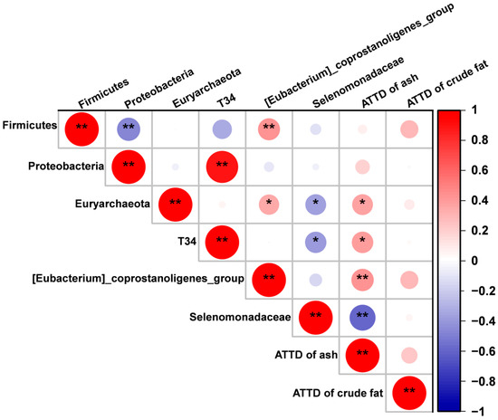 Pearson correlation analysis was conducted to examine the correlation relationships between the cecum microbiota and ATTD of nutrients (Figure 7). The results indicated that the abundance of Selenomonadaceae was negatively correlated with the ATTD of ash, whereas the abundance of [Eubacterium]_coprostanoligenes_group was positively correlated with the ATTD of ash (p < 0.05). Additionally, the abundance of T34 and Euryarchaeota showed a tendency toward positive correlation with the ATTD of ash (p < 0.10).