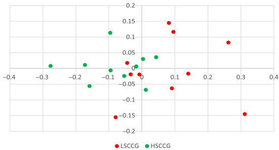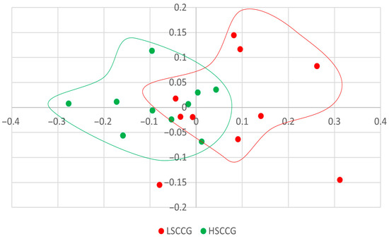 To make observations regarding beta diversity, principal coordinate analysis (PCoA) plots were constructed. In Figure 1, the composition (membership) graph comparing LSCCG vs. HSCCG can be observed, i.e., considering all the bacteria present regardless of their abundance. In this type of graph, the closer the points are to each other, the greater the similarity between the oral microbiota of each horse, and the farther apart they are, the greater the difference. Through this result it was possible to observe that there is no clear pattern of separation between the groups, and for this reason, no significance was observed (p = 0.107).