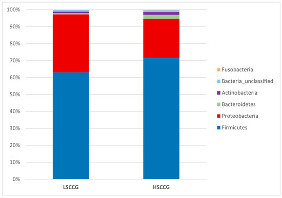 Graph with relative abundance regarding the phyla comparing LSCCG vs. HSCCG.