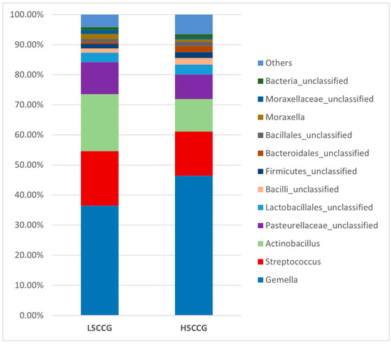 Graph with the relative abundance regarding the genera comparing LSCCG vs. HSCCG.