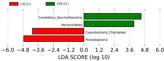 Linear Discriminant Analysis (LDA Score) of phyla that showed significant differences (LDA > 2) comparing LSCCG vs. HSCCG.