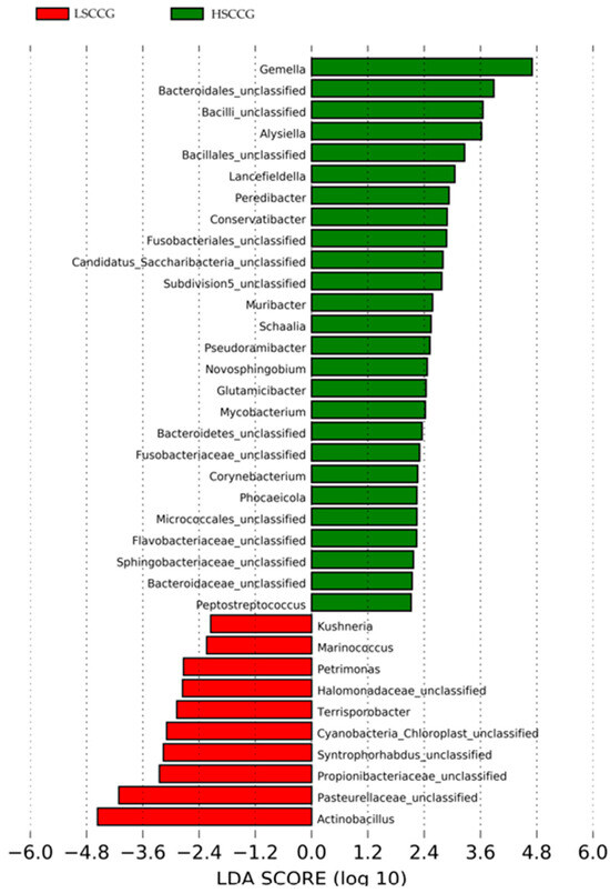 Linear Discriminant Analysis (LDA Score) of genera that showed significant differences (LDA > 2) comparing LSCCG vs. HSCCG.