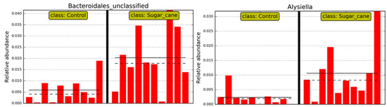 Additionally, a Linear Discriminant Analysis (LDA Score) was performed in order to demonstrate associations between each bacterial genus and the studied groups. When the LDA value is greater than two for a genus in each group, it implies that this microorganism has a significantly higher relative abundance than in the other group, being considered a potential marker for that type of diet. The same applies to other taxonomic orders such as phylum, class, order, etc. Figure 5 illustrates the phyla Candidatus Saccharibacteria and Bacteroidetes, which showed a difference in the HSCCG, and Cyanobacteria_Chloroplast and Proteobacteria for the LSCCG. Regarding the genera, Figure 6 highlights those that were significant (LDA > 2).