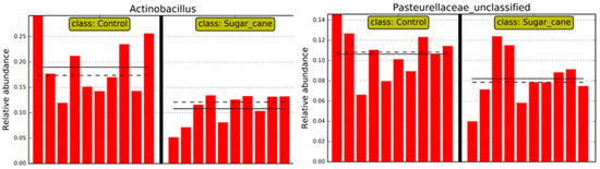 Thus, regarding the bacterial genera, those that were considered significant in each group LSCCG vs. HSCCG in the Linear Discriminant Analysis (LDA Score) were the ones with an LDA > 2 (Figure 6), and data for each genus were obtained for each animal in the different groups. Therefore, the genera Bacteroidales and Alysiella were the most discriminative in the HSCCG, and Actinobacillus and Pasteurellaceae_unclassified in the LSCCG (Figure 7 and Figure 8).