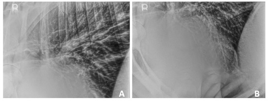 Standing thoracic radiography of a 2-year-old Aberdeen Angus with double-outlet right ventricular malformation. (A): Diffuse broncho-interstitial pattern throughout the lungs. (B): Diffuse broncho-interstitial pattern throughout the lungs, with a focal alveolar pattern caudoventrally to the apex of the heart.