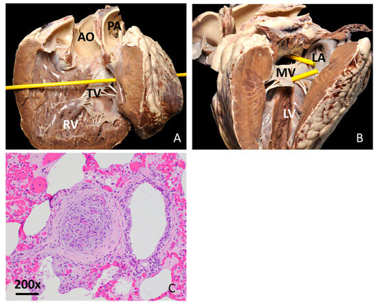Heart post-mortem findings in a 2-year-old Aberdeen Angus cow with double-outlet right ventricular malformation. (A): Sagittal section through the right heart, viewed from a right lateral perspective. The right ventricular (RV) wall is markedly thickened. The aorta (AO) and pulmonary artery (PA) both stem from the RV. The yellow probe passes through perimembranous ventricular septal defect. TV: Tricuspid valve; AO: Aorta; PA: Pulmonary artery. (B): Sagittal section through the left heart viewed from a left lateral perspective. The yellow probes pass through septal defects: the upper probe passes through the secundum atrial septal defect in the interatrial septum, while the lower probe passes through a perimembranous ventricular septal defect in the interventricular septum. LV: Left ventricle; MV: Mitral valve; LA: Left atrium. (C): Lung, plexiform arterial proliferation of endothelial cells. Hematoxylin and eosin, 200×. Bar: 50 µm.