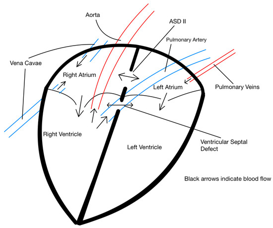 Schematic representation of intracardiac and great vessel anatomy illustrating abnormal blood flow patterns in a heart of a 2-year-old Aberdeen Angus cow with an atrial septal defect (ASD II) and a ventricular septal defect (VSD). The aorta and pulmonary artery both originate from the right ventricle, consistent with a double-outlet right ventricle (DORV). Black arrows indicate blood flow direction. Note the left-to-right shunting at the atrial level and the complex flow dynamics at the ventricular level due to the septal defects.