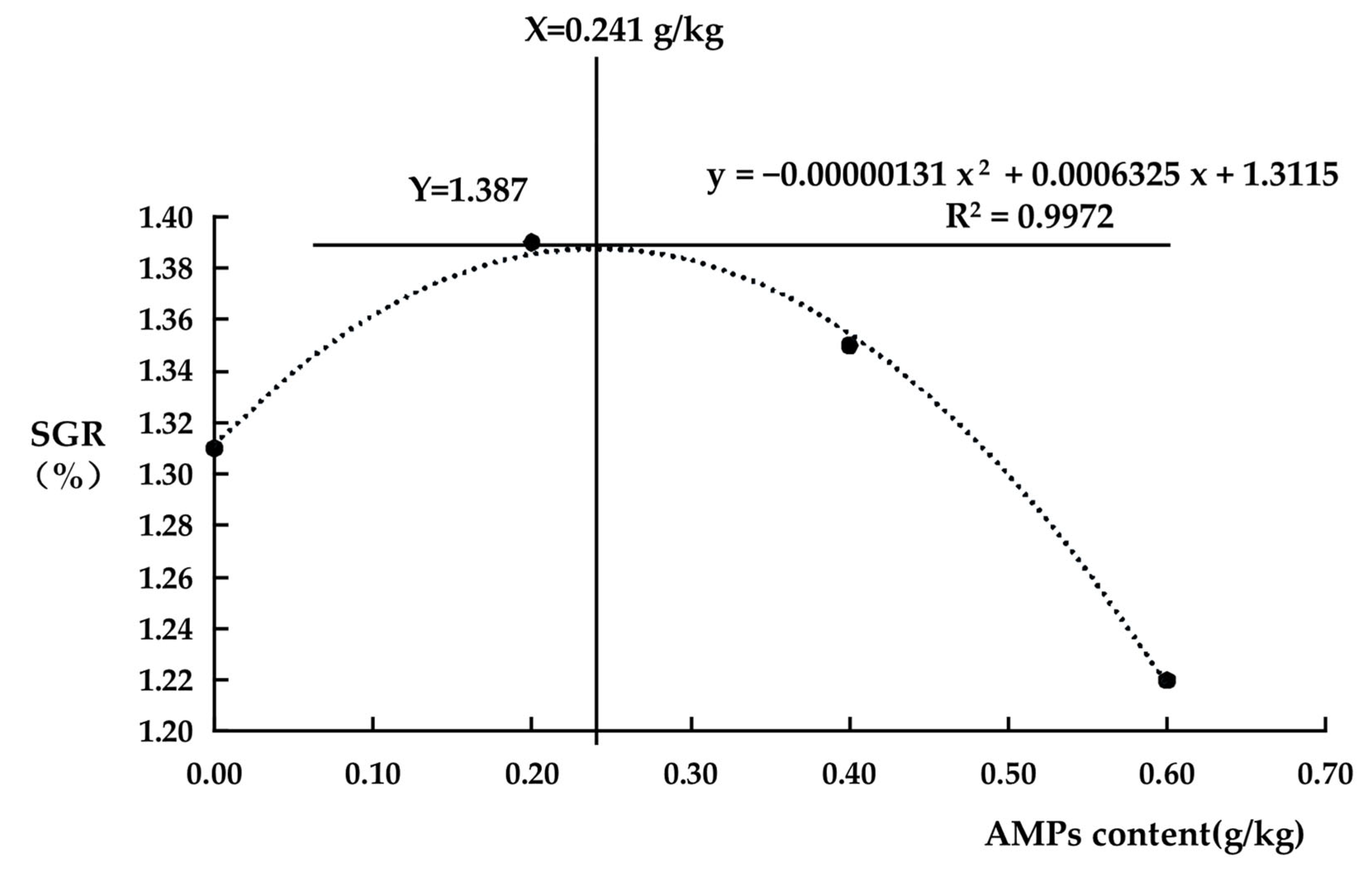 The dose–effect relationship between AMPs content and SGR (quadratic polynomial fit) is displayed in Figure 1. Therefore, under the experimental conditions, the optimal dosage of growth-promoting AMPs was determined to be 0.241 g/kg.
