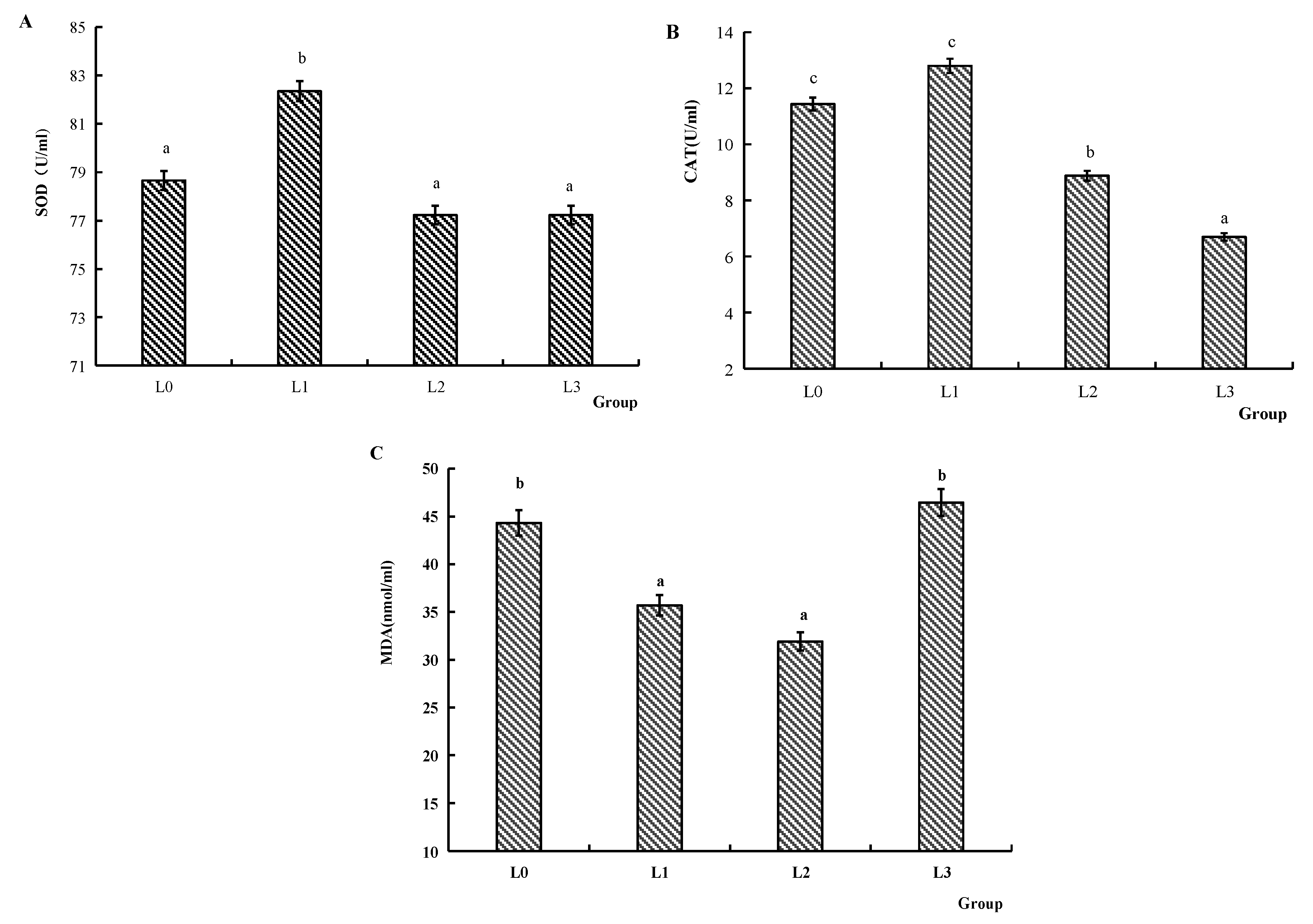 Figure 2 illustrates the serum antioxidant capacity. The SOD activity of group L1 was significantly higher compared to groups L0, L2, and L3 (p < 0.05). The CAT activity of groups L0 and L1 was significantly increased compared to groups L2 and L3 (p < 0.05). The MDA content of groups L1 and L2 was significantly reduced compared to groups L0 and L3 (p < 0.05).