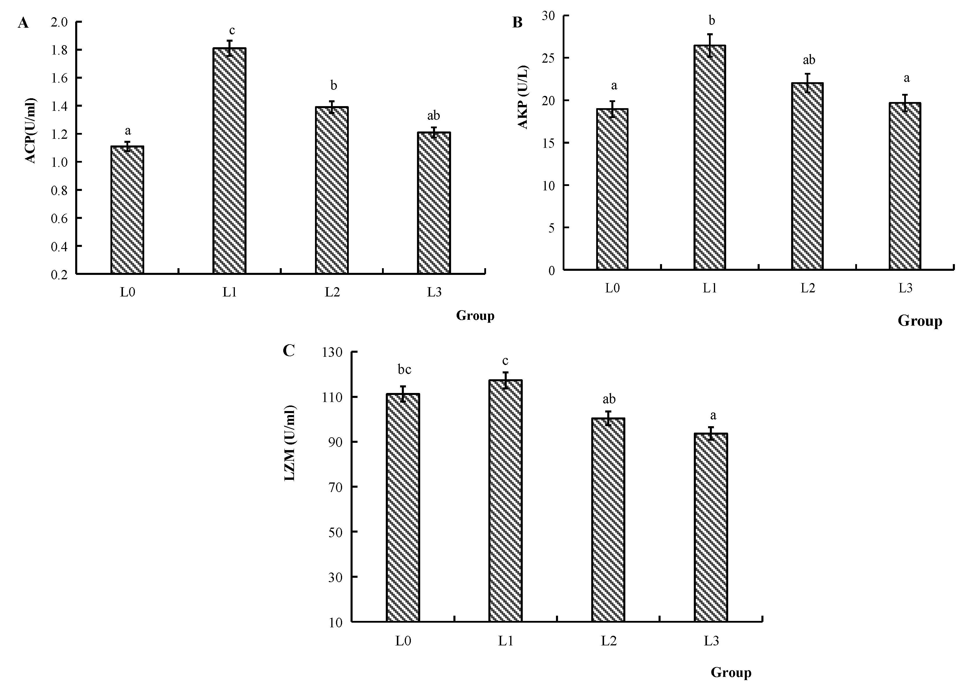 Figure 3 illustrates the serum immune-related enzyme activities. The ACP activity of groups L1 and L2 was significantly increased compared to group L0 (p < 0.05). The AKP activity of group L1 was significantly increased compared to groups L0 and L3 (p < 0.05). Compared to groups L2 and L3, the LZM activity of group L1 was significantly increased (p < 0.05).