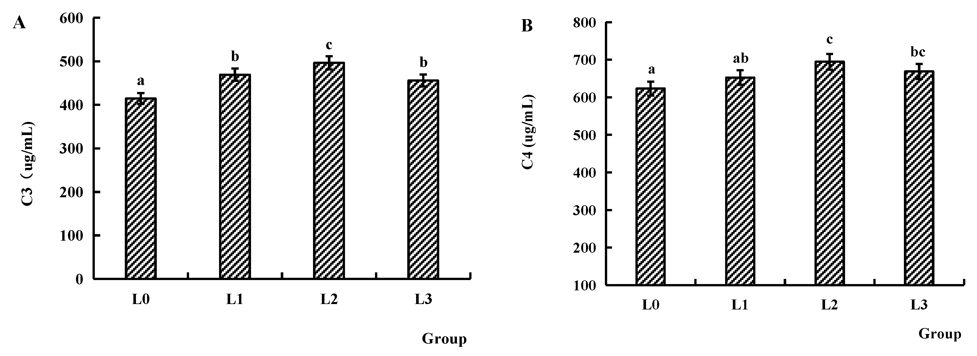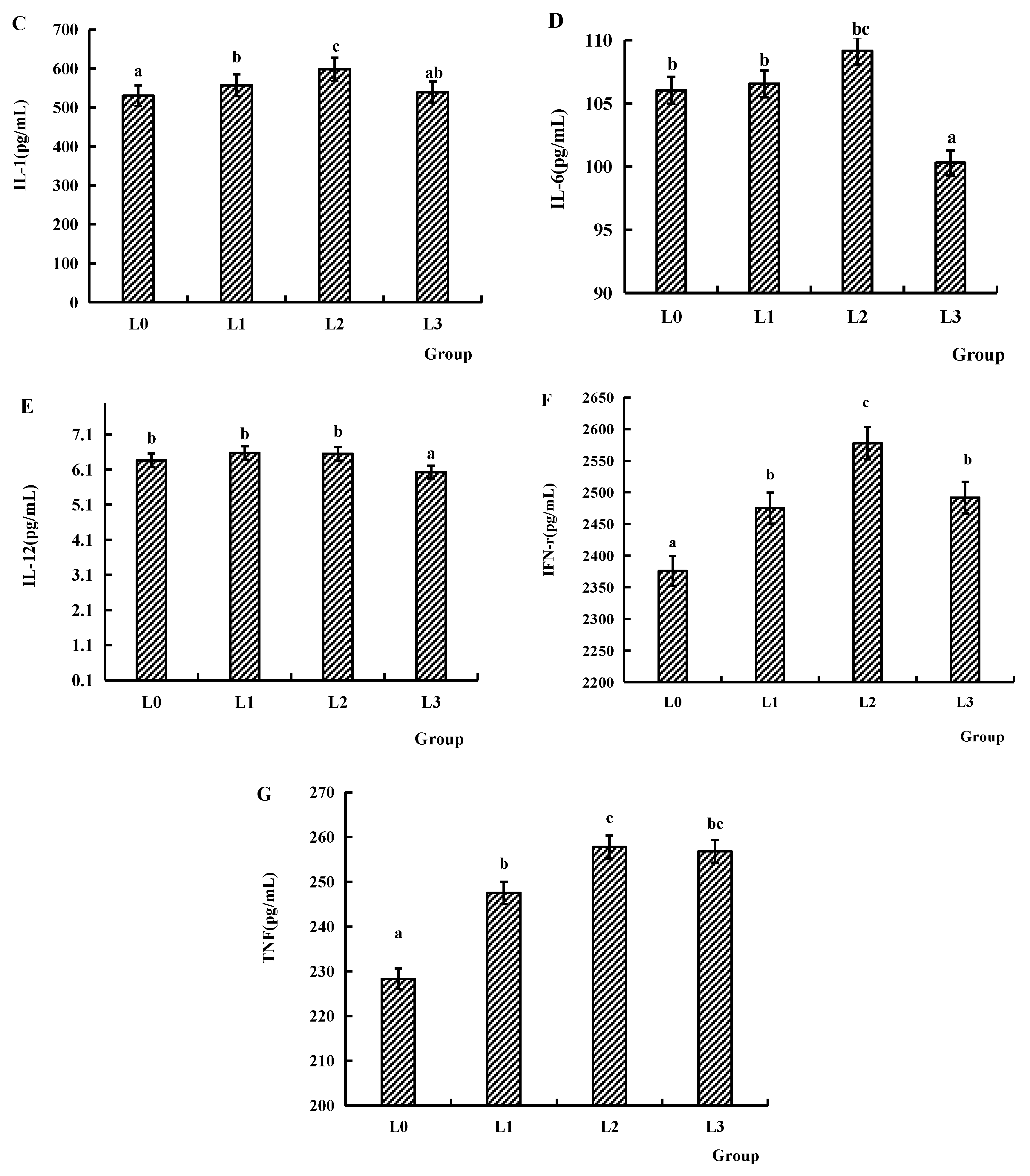 Figure 4 illustrates serum immune factor levels. The C3 content of groups L1, L2, and L3 was significantly higher compared to group L0 (p < 0.05). Similarly, C4 content of groups L2 and L3 was significantly higher than that of group L0 (p < 0.05). For inflammatory cytokines, the IL-1 level of groups L1 and L2 was significantly higher than that of group L0 (p < 0.05). The IL-6 and IL-12 levels of groups L0, L1, and L2 were significantly increased compared to group L3 (p < 0.05). The levels of TNF and IFN-γ of groups L1, L2, and L3 were significantly higher compared to group L0 (p < 0.05).