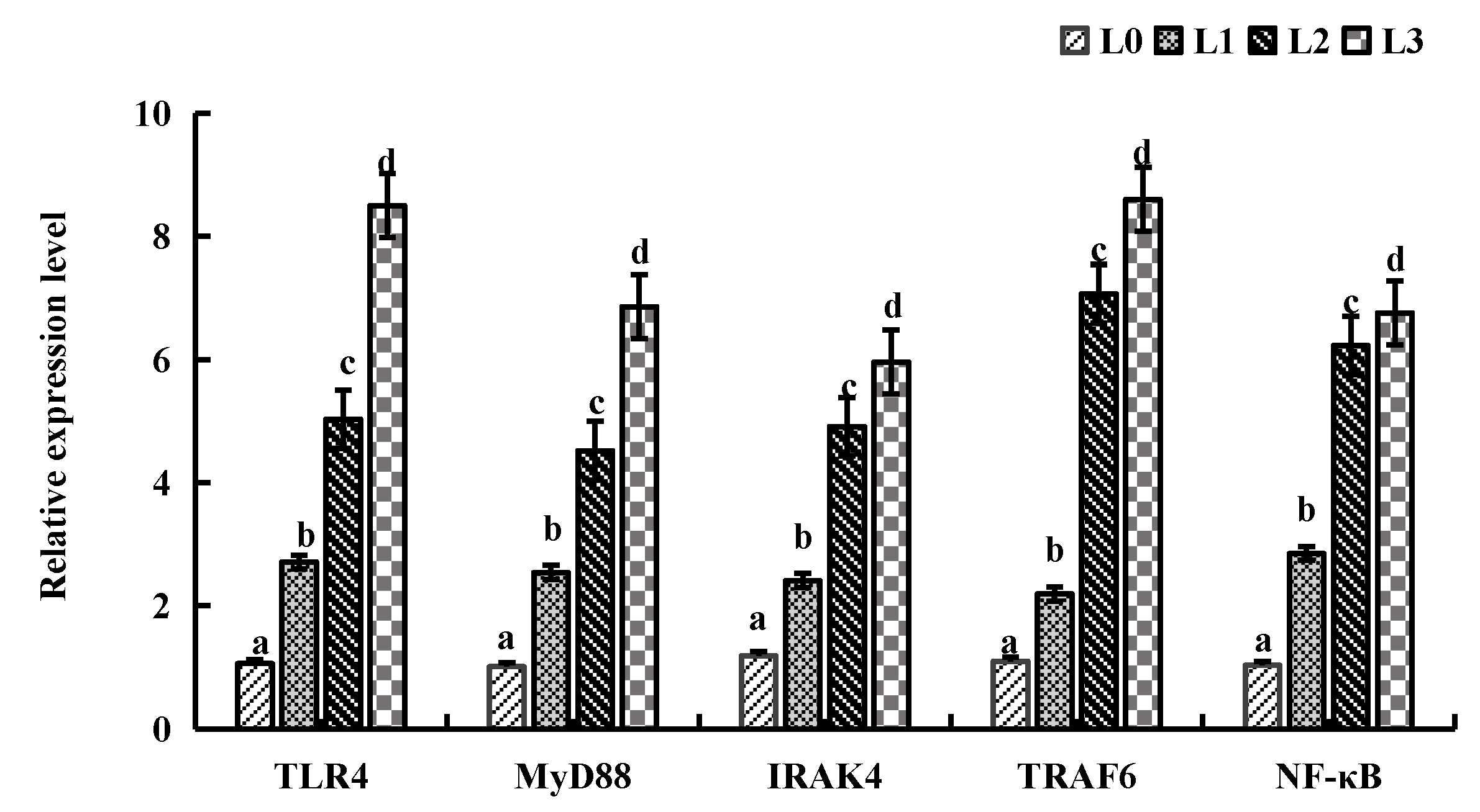 Figure 5 illustrates the relative mRNA expression levels of key genes in liver tissue. Compared to group L0, the relative mRNA expression levels of key genes (TLR4, MyD88, IRAK4, TRAF6, and NF-KB) of groups L1, L2, and L3 were significantly upregulated (p < 0.05).