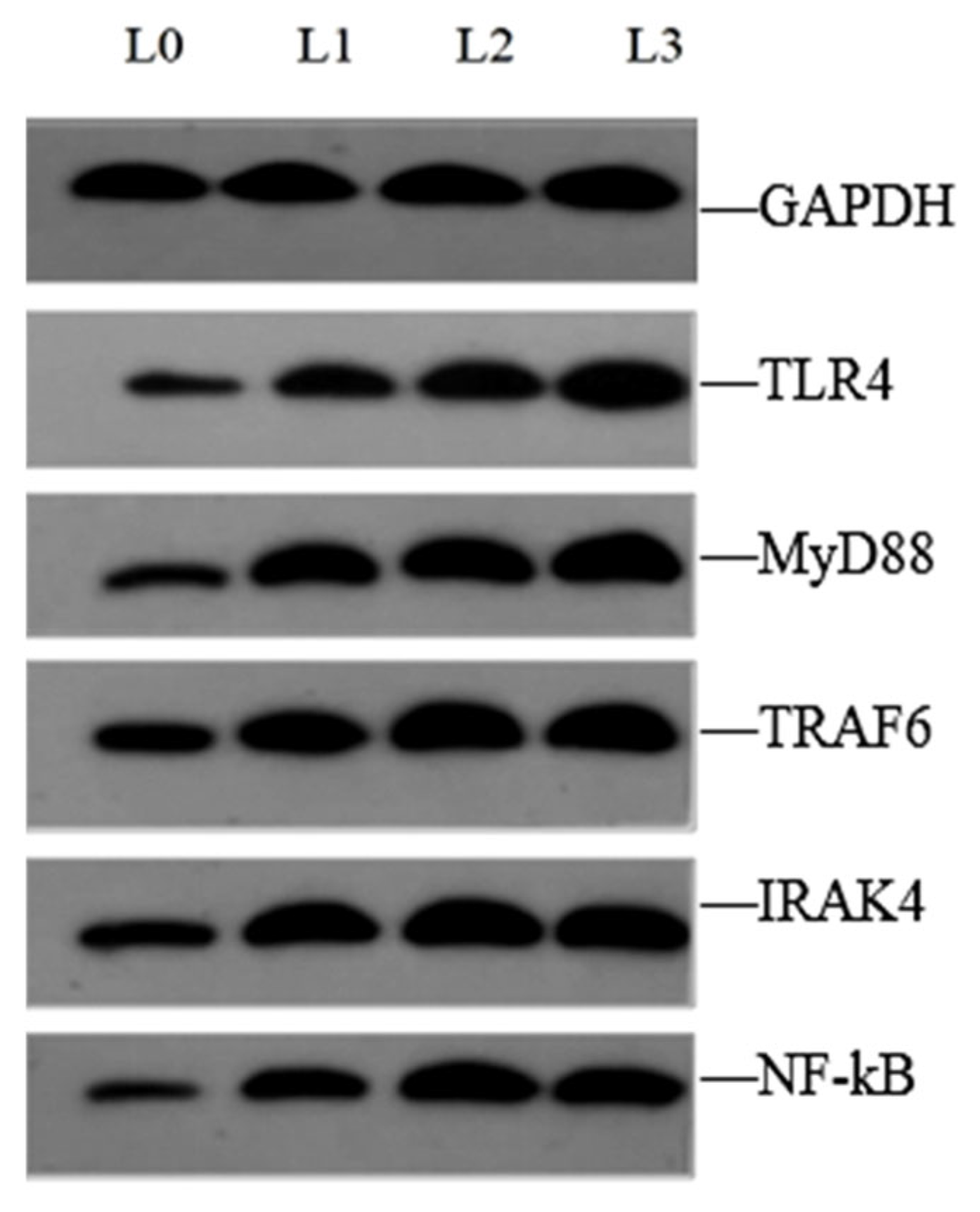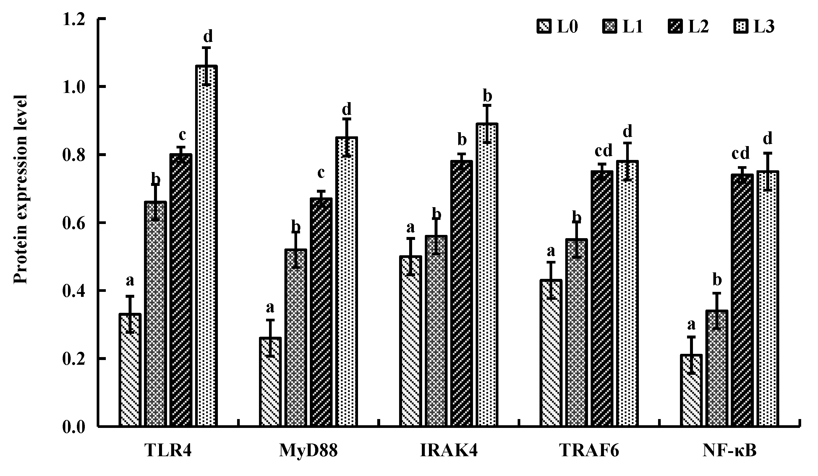 Figure 6 and Figure 7 illustrate the protein expression levels of key genes in liver tissue. Compared to group L0, the protein expression levels of key genes (TLR4, MyD88, IRAK4, TRAF6 and NF-KB) of groups L1, L2, and L3 were significantly upregulated (p < 0.05).