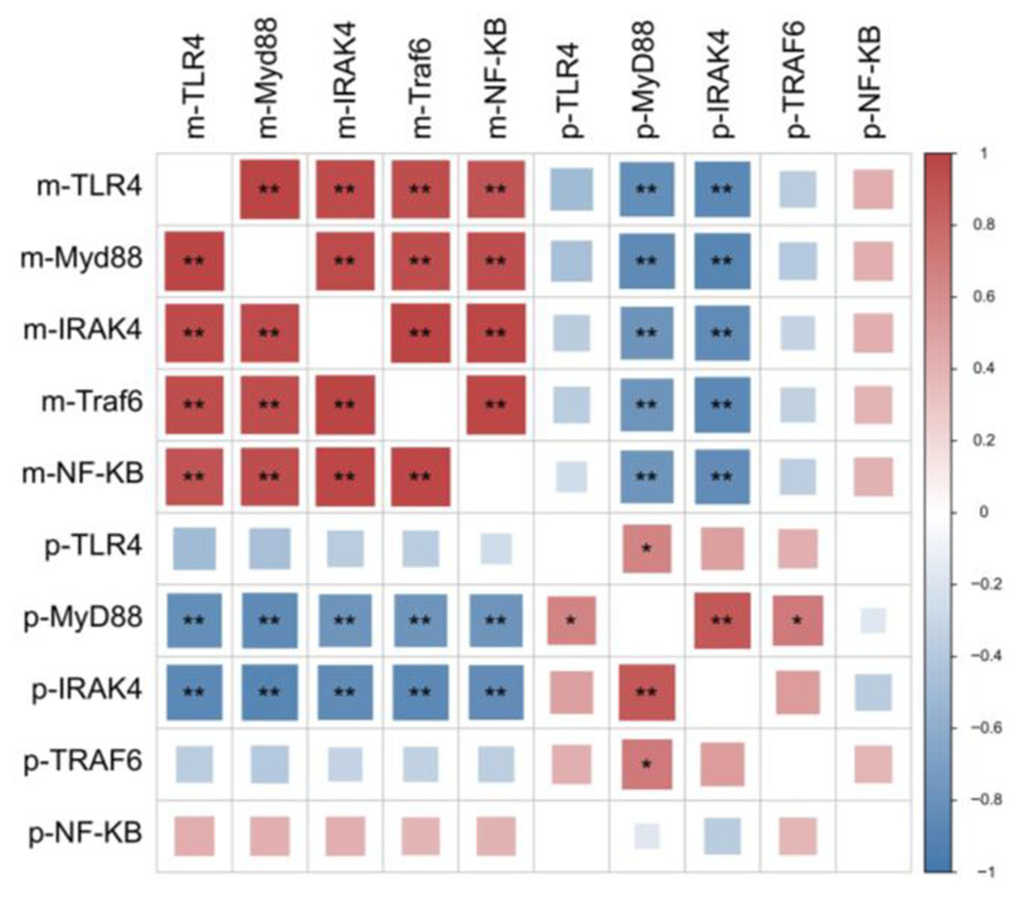 Figure 8 illustrates the correlation analysis of the relative mRNA expression levels and protein expression levels of key genes (p-TLR4, p-Myd88, p-IRAK4, p-Traf6, p-NF-κB). A significant positive correlation was observed between mRNA expression levels of these genes (p < 0.05). In contrast, a significant negative correlation was found between the relative mRNA expression levels and protein expression levels of these genes (p < 0.05).