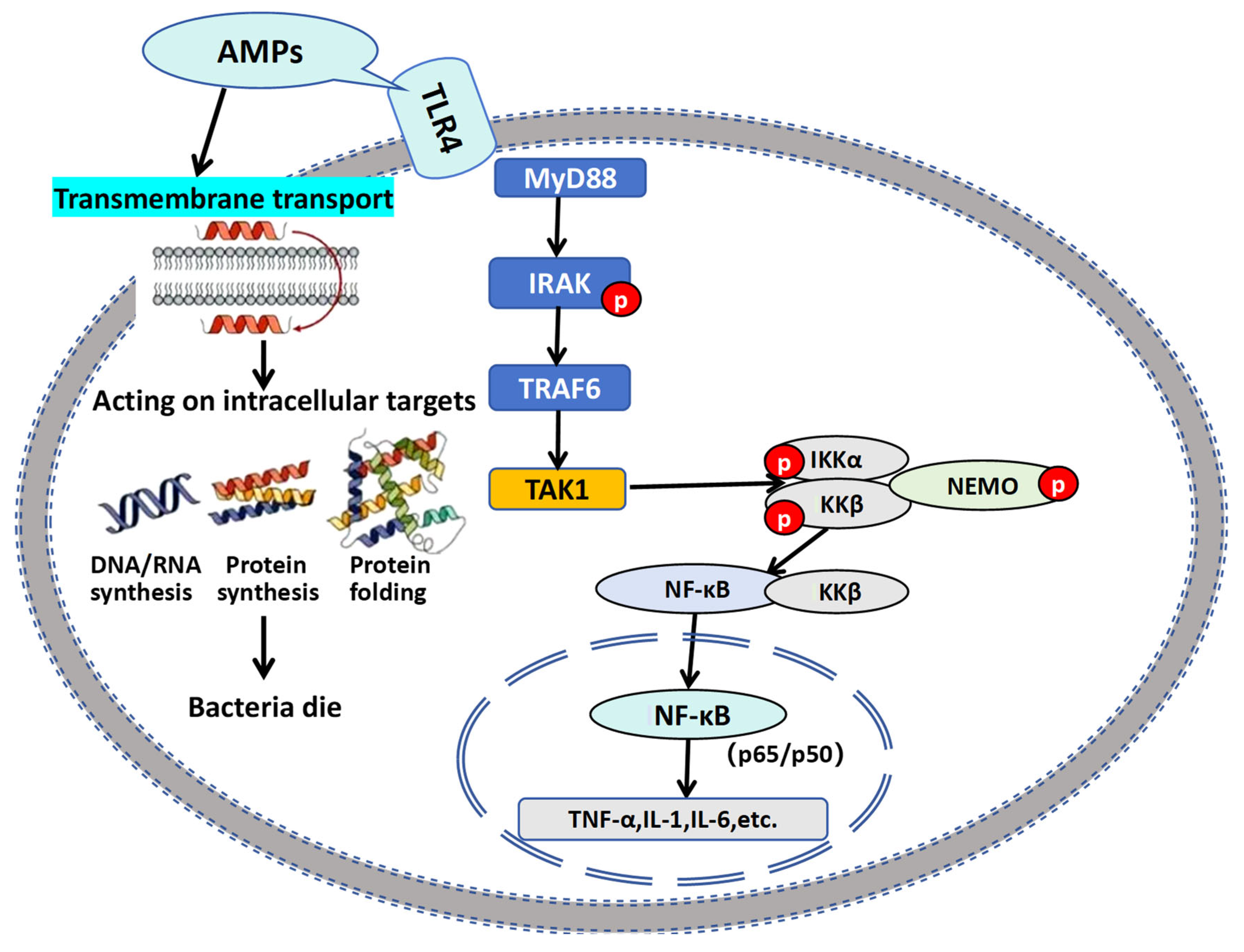 To further clarify the molecular basis of how AMPs engage the TLR4/NF-κB pathway, we integrated our findings with established signaling frameworks in aquatic species. Collectively, these studies establish that AMPs serve as crucial immunomodulators by two core mechanisms: (1) regulating innate immune responses through pattern recognition receptor (PRR) pathways; (2) orchestrating cytokine networks. AMPs bind to the TLR4/MD-2/CD14 complex on cell membranes via their positively charged domains, inducing conformational changes and dimerization of TLR4. The intracellular TIR domain of TLR4 then recruits the MyD88 adapter protein, which subsequently activates the IRAK kinase family. Through the TRAF6-TAK1-IKK cascade, this process triggers phosphorylation and ubiquitin-mediated degradation of IκBα, ultimately promoting nuclear translocation of NF-κB (p65/p50) dimers. Once in the nucleus, NF-κB binds to κB sites in the promoters of target genes, systematically regulating downstream immune responses (Figure 9).