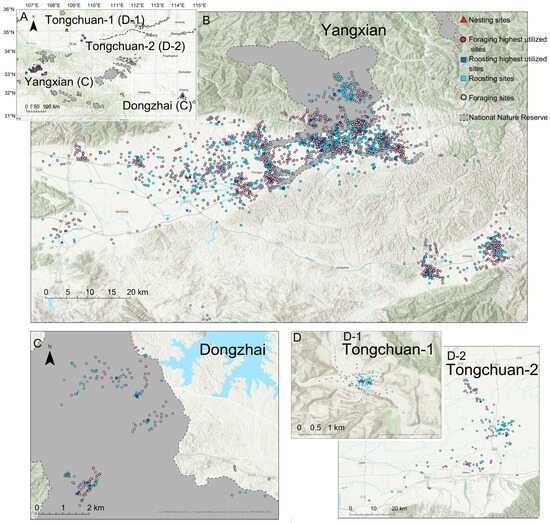 (A) Location of three study areas and associated Crested Ibis foraging, roosting, and nesting sites. More detailed views of each study area are provided in (B) Dongzhai, (C) Yanxian, and (D) Tongchuan. Since the two regions of Tongchuan were somewhat far apart, -1 and -2 were used to represent them. Highest utilized sites represent the most frequently used roosting and foraging locations for each individual bird annually.